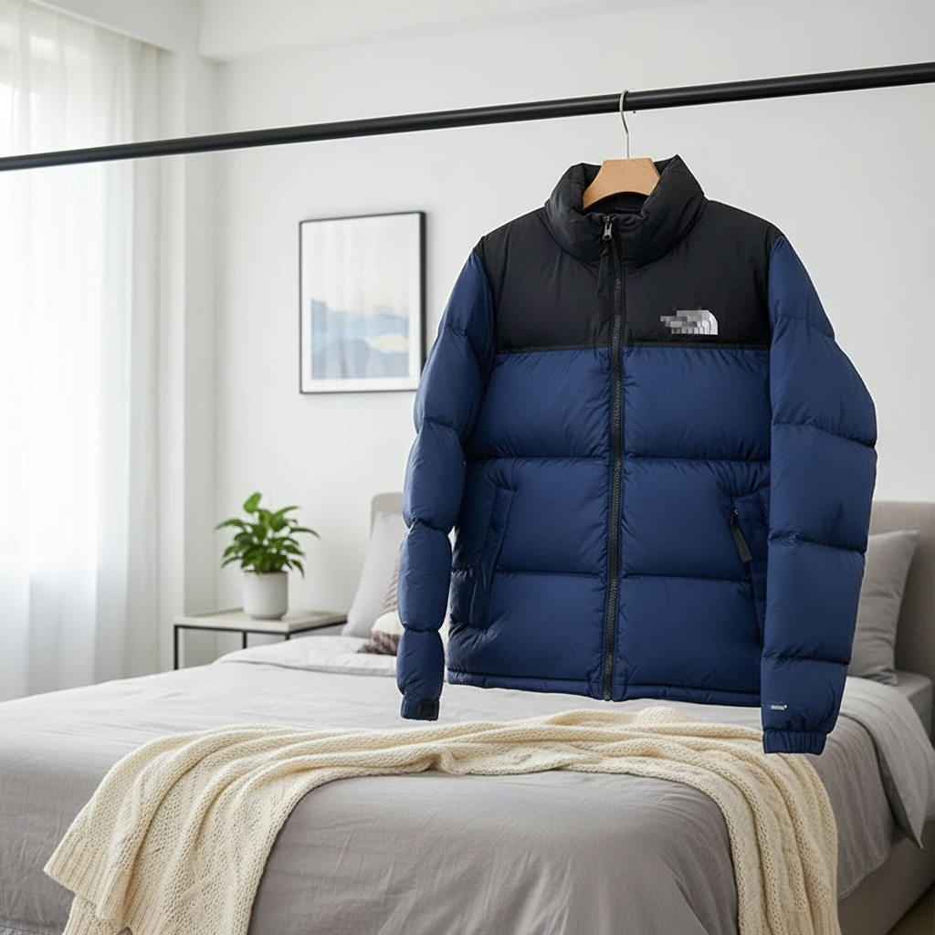 The North Face blue and black down jacket, warm and stylish with high collar and front zipper, unisex outdoor design, premium insulation, classic color block look, perfect for daily wear or adventures.