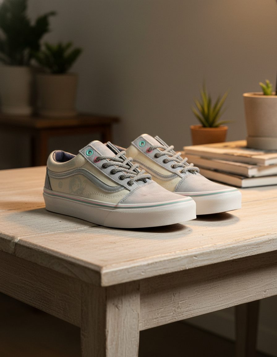 Vans Old Skool Light Gray Off-White Sneakers, canvas and suede mix, silver side stripe, pink-green eyelet details, printed totem design, street style, unisex, durable and comfy for everyday wear.