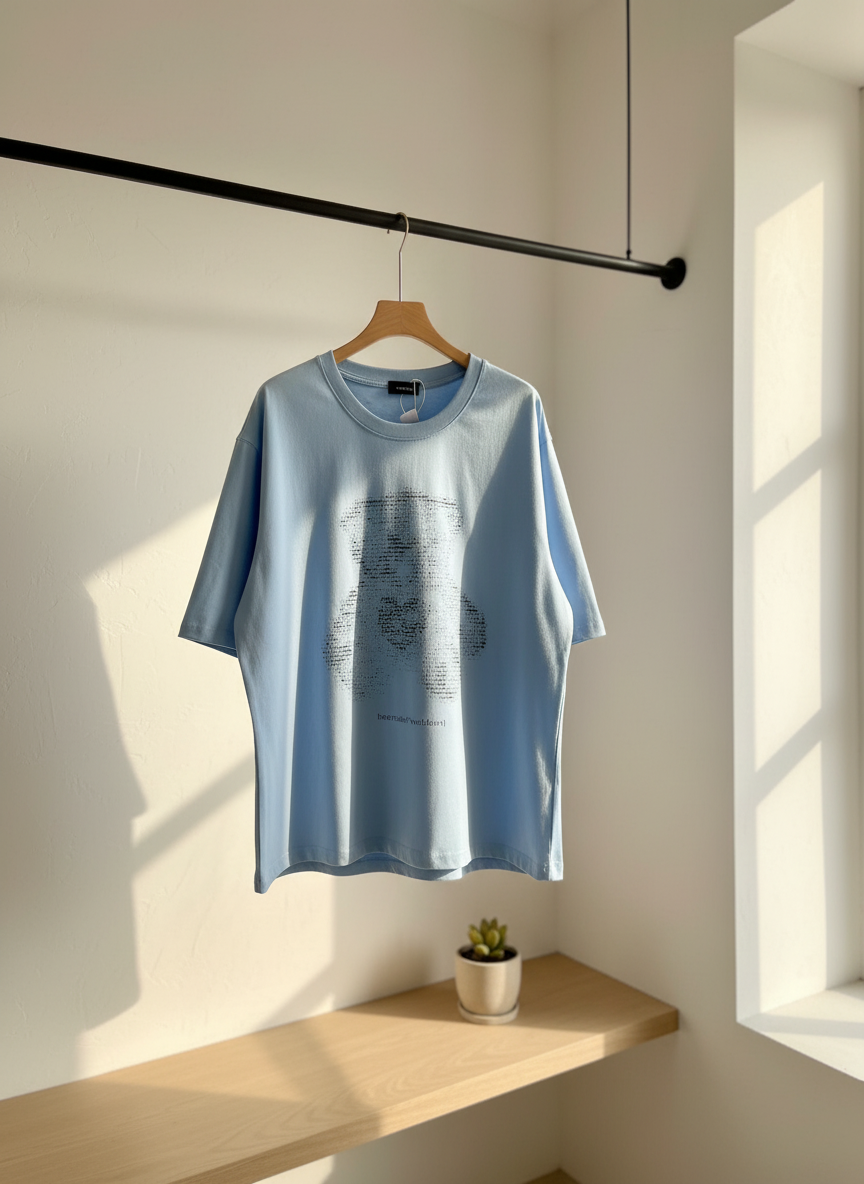 WE11DONE x BE@RBRICK Light Blue Oversized T-Shirt, soft breathable cotton, bear graphic text print, unisex streetwear design, perfect for daily casual outfit and trendy fashion style.