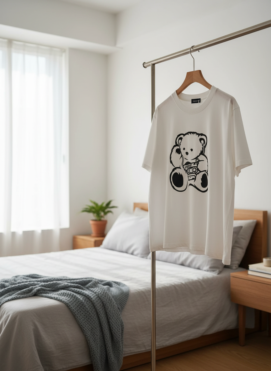 WE11 Bear Series White Loose T-Shirt, made of soft breathable cotton, features a black bear print, unisex streetwear style, perfect for daily casual looks and effortless trendy outfits.