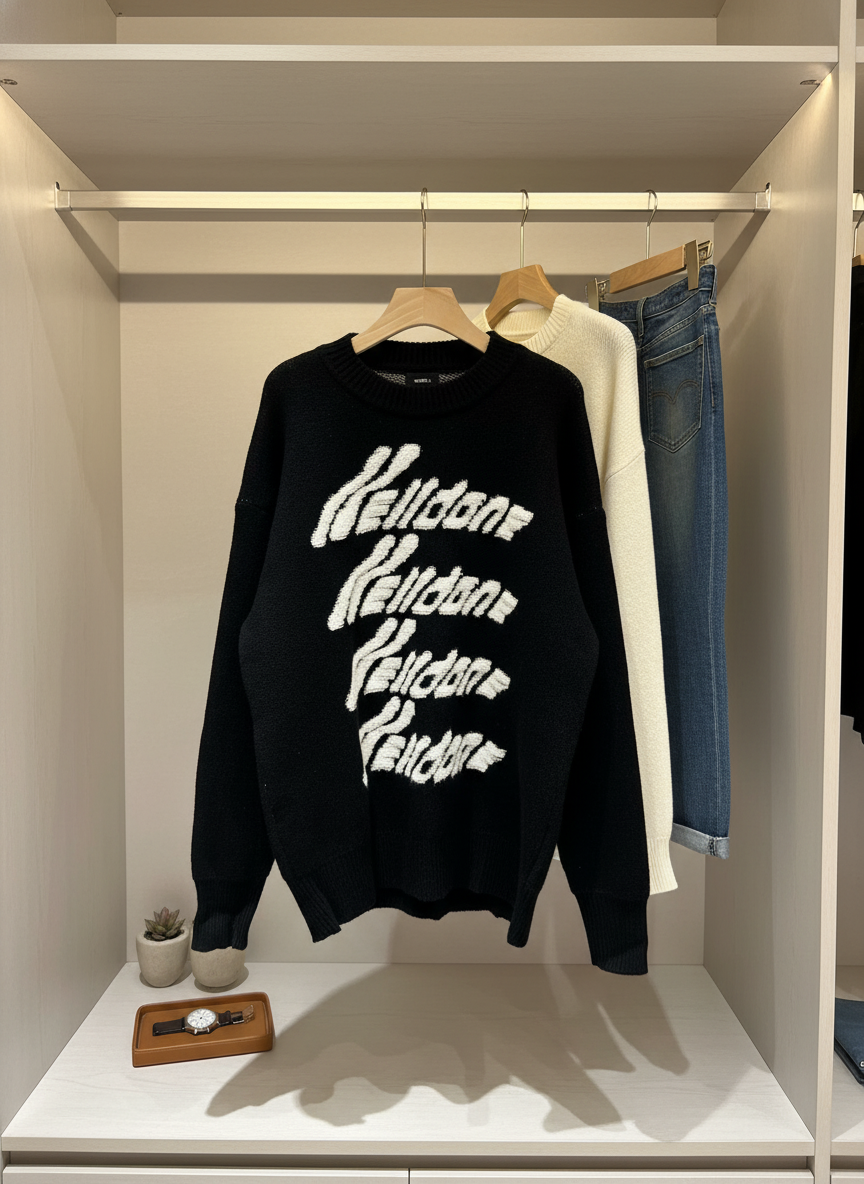 WE11DONE Black Knitted Sweater, crafted from soft knit fabric for warmth and comfort, features repeated white WE11DONE logo design, unisex street style, perfect for daily casual fashion wear.