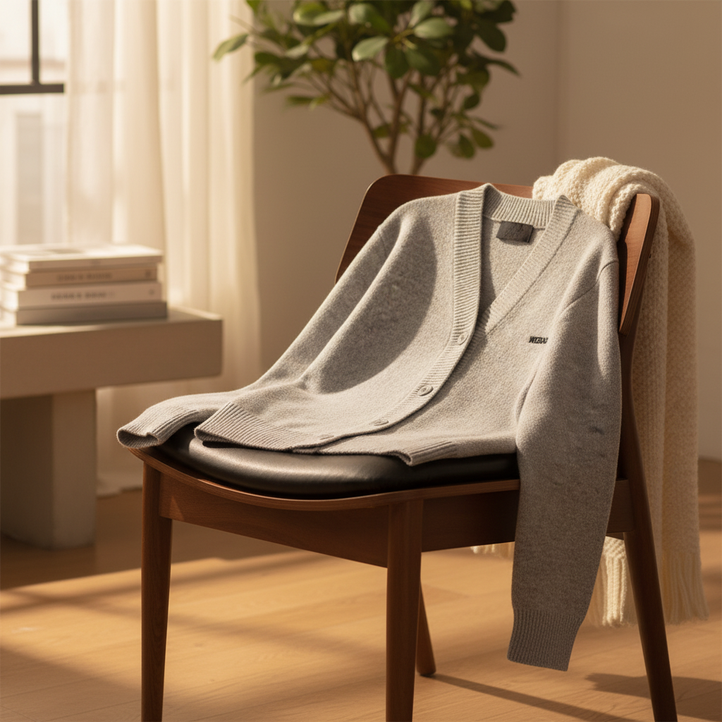 WE11DONE Grey Knit Cardigan, made from soft fabric with a V-neck button design, brand logo on chest, unisex fit, warm, stylish, comfortable, perfect for daily casual wear and versatile fashion.