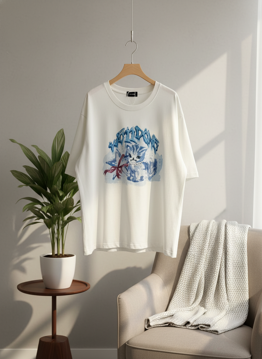 WE11DONE White Oversized T-Shirt, soft breathable cotton, features blue and red cat graphic and brand logo, unisex streetwear style for casual outfits with a bold trendy look.