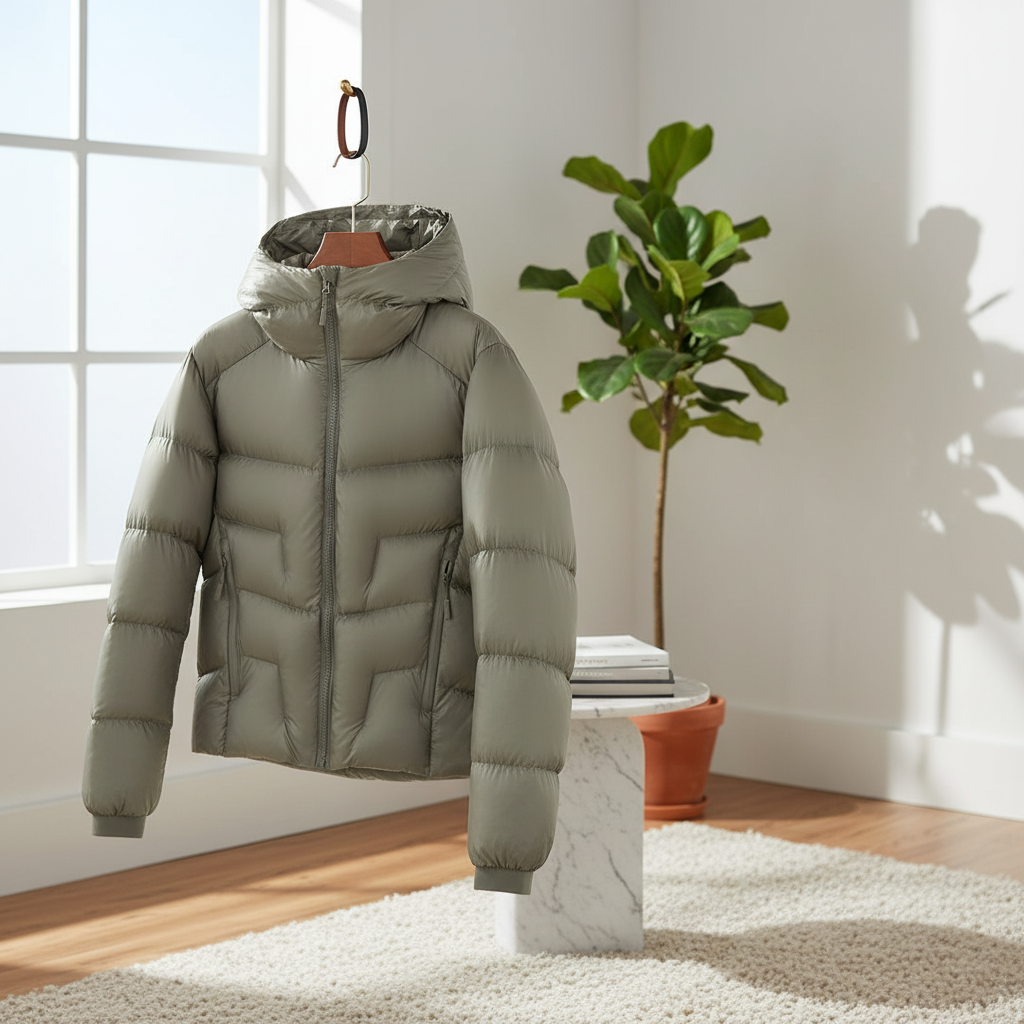 Other Minimalist Series Light Gray Down Jacket – lightweight waterproof fabric, warm hooded design, windproof, zip pockets, unisex style for comfort and fashion in daily commute and casual wear.
