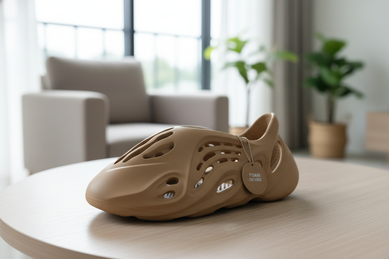 Yeezy Foam Runner Sand color casual slides, lightweight foam construction with breathable hollow design, unisex streetwear style by Kanye West, fashionable, versatile, and comfortable.