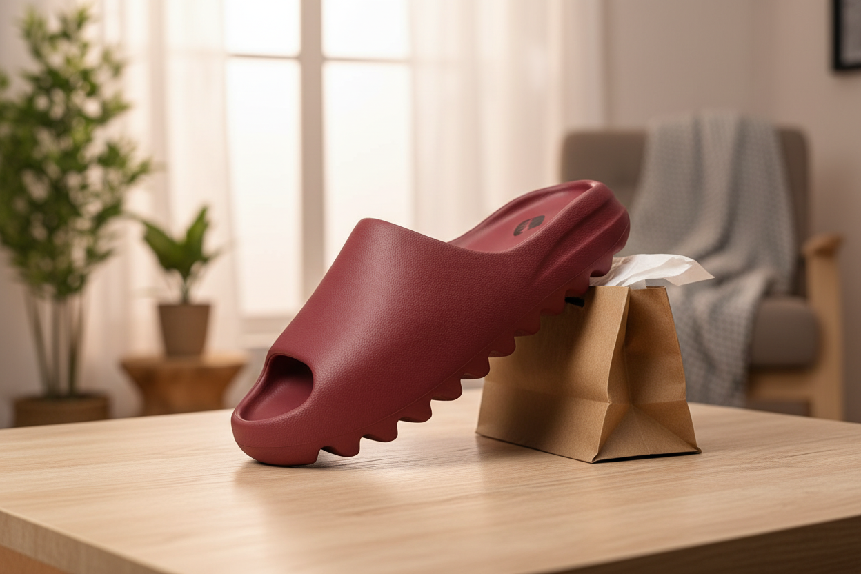 Yeezy Slide Wine Red—lightweight foam design with serrated anti-slip sole, street-style look for men and women, perfect for daily wear with comfort and personality.